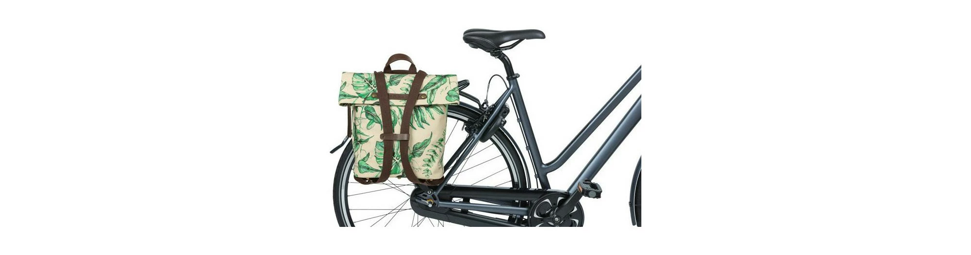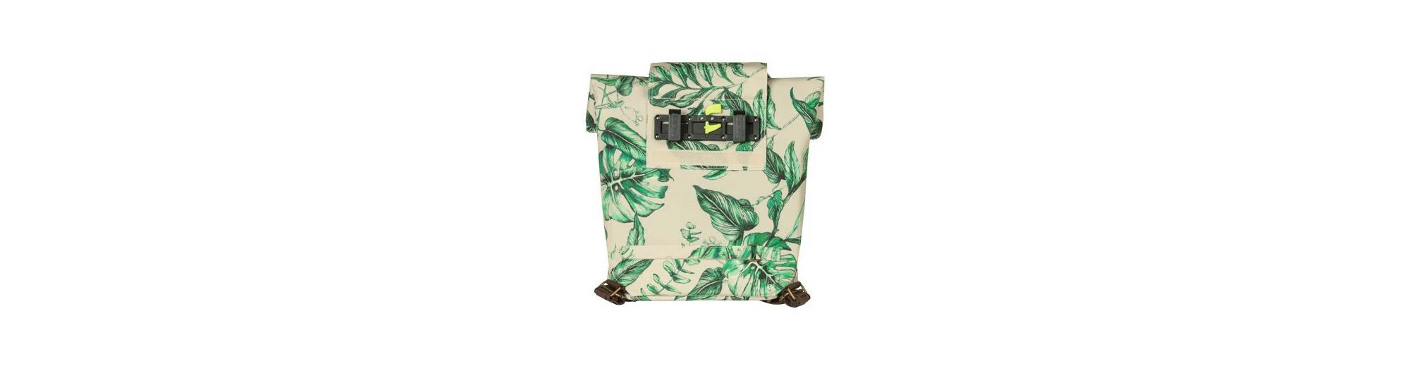 Le sac à dos pour vélo Basil Ever Green est fabriqué à partir de 40 % de plastique PET recyclé. Le tissu déperlant contient 21 bouteilles en plastique recyclées de 350 ml, mais il est semblable au coton. Le cuir végétal, l’imprimé végétal peint à la main et les pièces en bronze à l’aspect antique sont autant d’atouts, et pas seulement en termes de mode. Vous pouvez utiliser le Basil Ever Green comme un sac à dos de vélo, un sac à main ou un sac à bandoulière. Grâce au système d’accrochage, vous pouvez facilement fixer le sac à votre porte-bagages. Les crochets disparaissent derrière une fermeture éclair lorsque le sac n’est pas attaché au porte-bébé. La fermeture pliable hydrofuge peut être fermée par une fermeture éclair. Des éléments réfléchissants sont fixés sur tous les côtés du sac pour vous rendre facilement visible à vélo ou à pied.